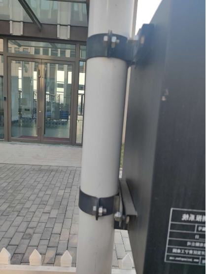 17、安裝固定百葉箱并穿線,將傳感器線從百葉箱進線孔(離燈桿底座1.5m、控制箱對面)穿入燈桿,從控制箱出線孔(離燈桿底座1.2m)穿出,然后固定支架并擰緊螺絲,注意百葉箱方向朝上